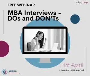 MBA Interviews – DOs and DON’ts – Free Webinar on April 19 ARINGO and unimy prep will hold a Webinar on April 19 about MBA interviews. Join for FREE and learn: How to ace a top ranked MBA interview The DOs and DON’TS you should know How to increase your chances for admission. Register now and get to ask all your questions live. REGISTER FOR FREE By ARINGO MBA Admissions Consulting|April 13th, 2022|Interviews|Comments Off on MBA Interviews – DOs and DON’ts – Free Webinar on April 19 Share This Story, Choose Your Platform! FacebookXRedditLinkedInTumblrPinterest Related Posts Coming up: October Interview Prep Sessions for Kellogg and LBS Gallery Coming up: October Interview Prep Sessions for Kellogg and LBS Think You Are Ready for MBA Interview? Take Our interview questions Quiz and Find Out! Gallery Think You Are Ready for MBA Interview? Take Our interview questions Quiz and Find Out! 17 ARINGO MBA Candidates invited to Wharton MBA interview Gallery 17 ARINGO MBA Candidates invited to Wharton MBA interview 7 ARINGO MBA Candidates invited to HBS MBA interview Gallery 7 ARINGO MBA Candidates invited to HBS MBA interview The Interview Season is starting! 5 ARINGO MBA Candidates invited to INSEAD MBA interview Gallery The Interview Season is starting! 5 ARINGO MBA Candidates invited to INSEAD MBA interview
